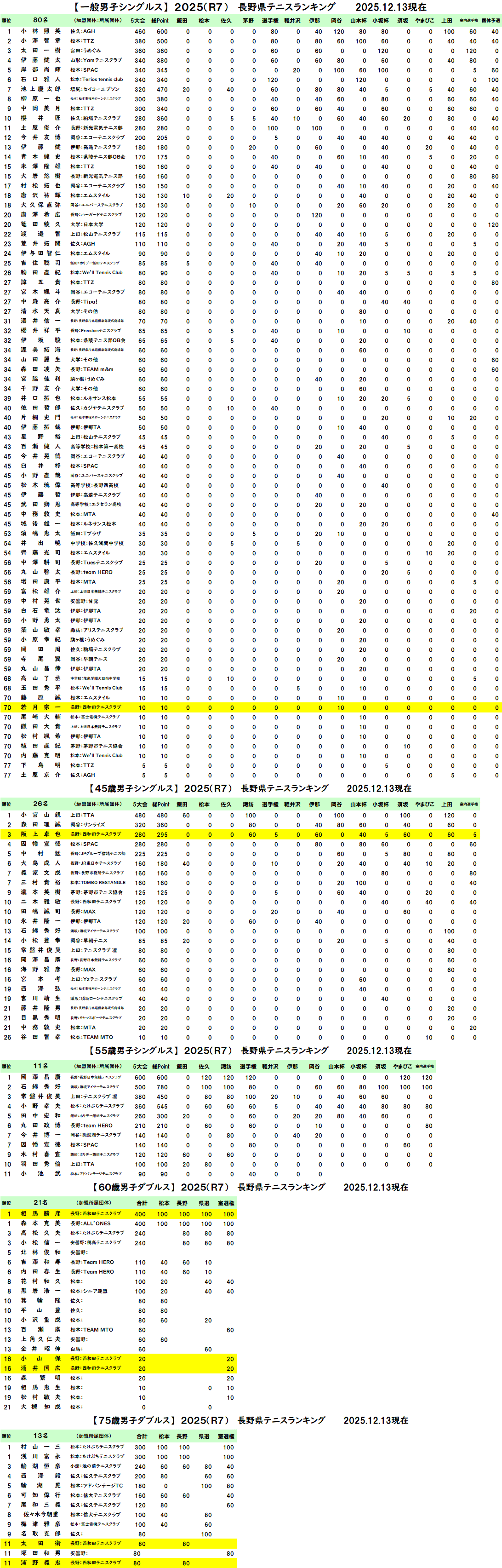 小山・涌井 ⇒ 5位:シニア県室内選手権60歳MD 相馬・涌井 ⇒ 4位:全シニア国エンジョイ60D 太田・青沼 ⇒ 4位:全シニア国エンジョイ70D 三輪・古澤 ⇒ 3位:須坂市民一般MD 三輪 ⇒ 3位:長野市民45歳S 三輪 ⇒ 3位:中野市長杯一般S 阪上 ⇒ 4位:長野県須坂45歳S 阪上 ⇒ 4位:長野県選手権45歳S 阪上 ⇒ 3位:諏訪ベテラン45歳S 三輪・古澤 ⇒ 3位:長野市民一般MD |