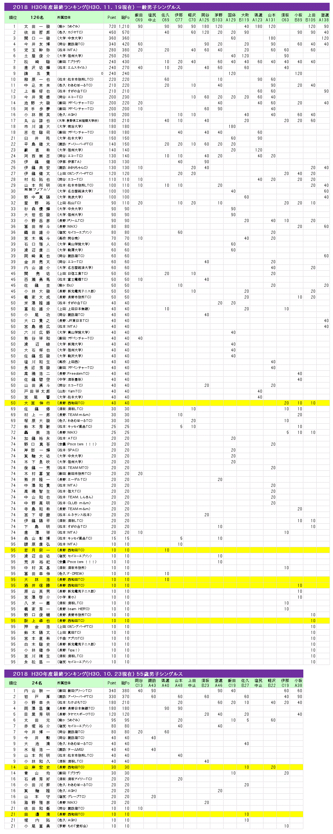 2018 H30年度最終ランキング(シングルス) ダブルス、ミックスはこちら
