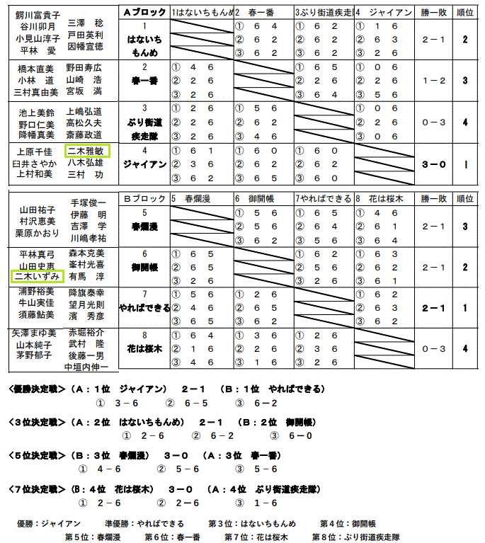 西和田Bチームそれなりに活躍しました。【?勝?敗】青沼正治、太田 衛、大林 浩、小野保憲、小山 保、三輪頁勢、武田はるみ、西澤朋子、水野由美子